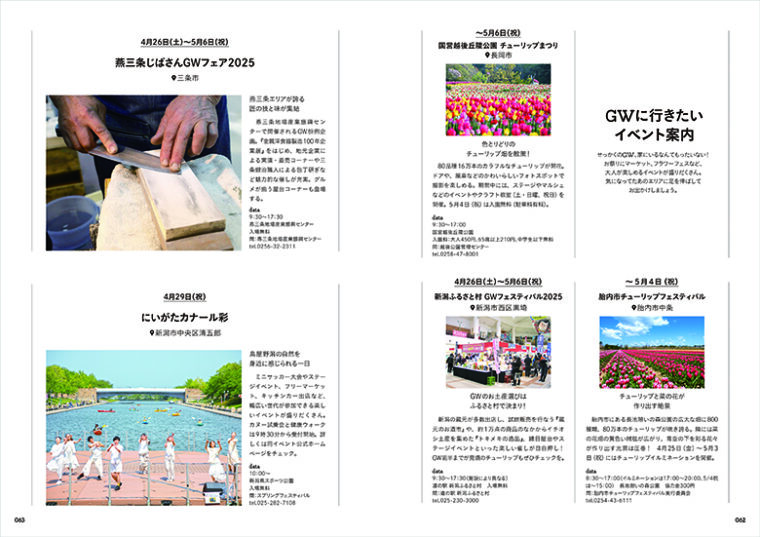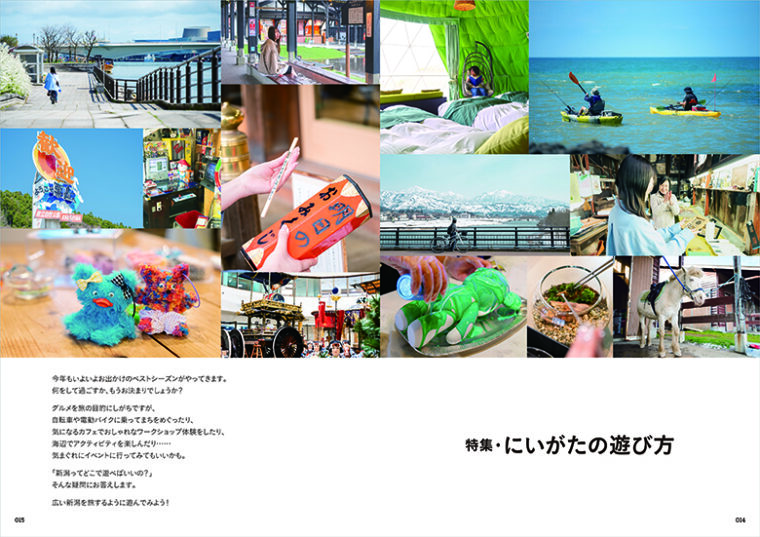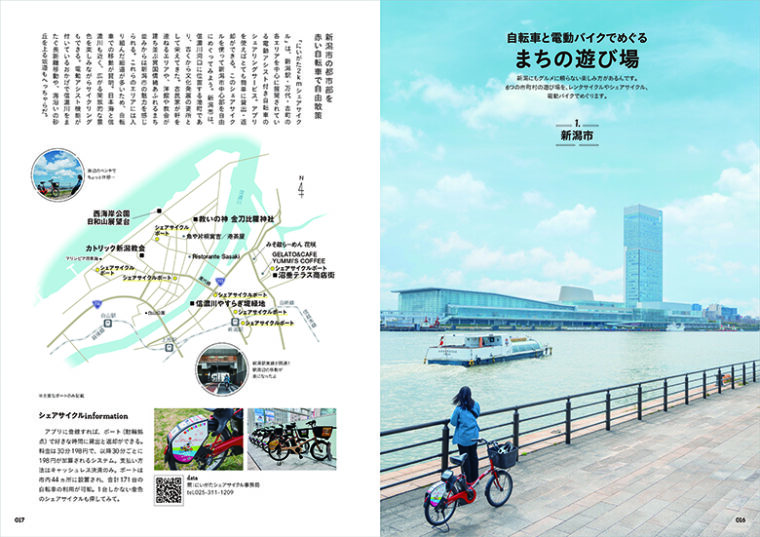 巻頭特集『にいがたの遊び方』では、自転車や電動バイクでまちの遊び場をめぐってみたり、カフェでおしゃれなワークショップを体験したり、海辺でアクティビティを楽しんだり、イベントに行ってみたり——「新潟ってどこで遊べばいいの?」、そんな疑問にお答えします!