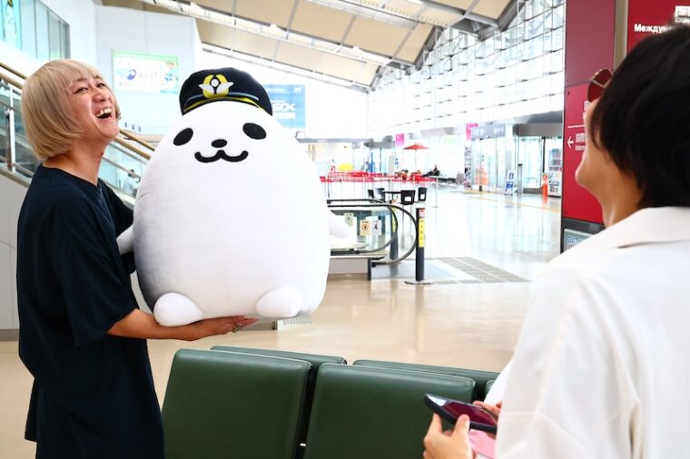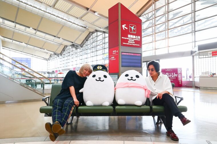 飛行機を見た後は、お米をモチーフにした新潟空港PRキャラクター・米(まい)るくんと米(まい)ちゃんと一緒に写真を撮ったよ。ふたりとも8月18日生まれで、ひなたのぴろんは8月17日が誕生日。近いね(笑)!