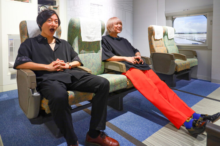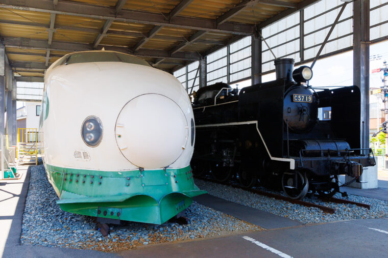 ドーンと迎えてくれる新幹線と蒸気機関車の前でポー
