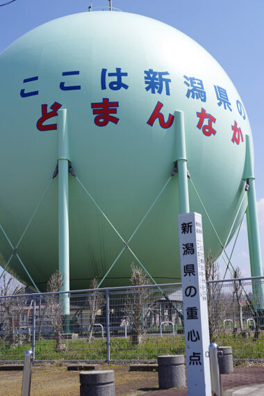 「ここは新潟県のどまんなか」の文字が入ったガスタンク!ではなく、その手前の石碑が重心点ですのでお間違えのないように。