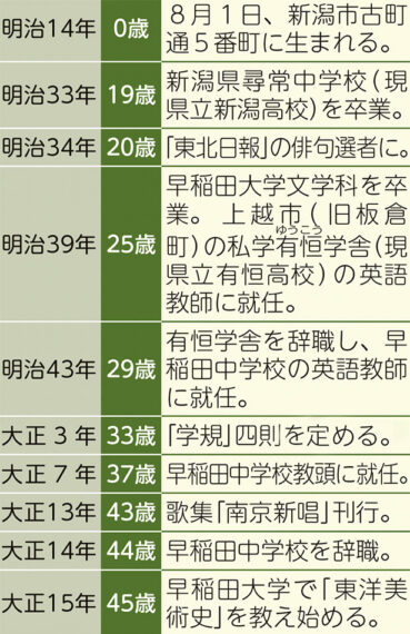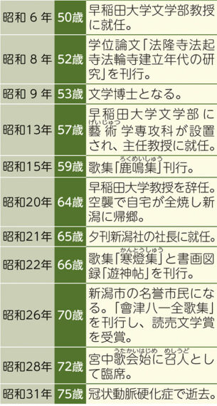 新潟出身や縁のある偉人はたくさんいますが、八一は晩年故郷の新潟に帰り、地元の文化振興に貢献した点でも高く評価されています。新潟で講演や展覧会を精力的に行ったり、地元新聞で随筆を書いたりしました。