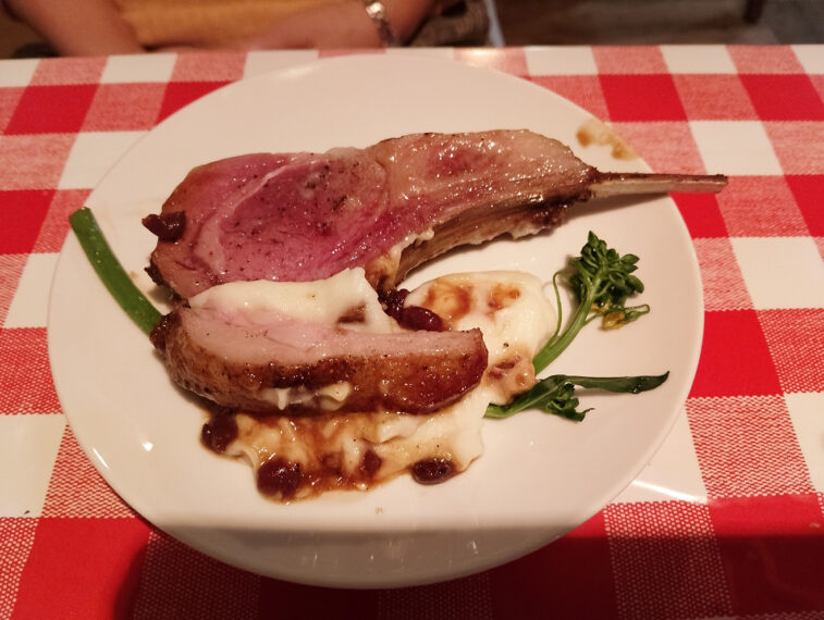 やわらかい骨付き仔羊のソテーはソースとともにワインとの相性抜群。